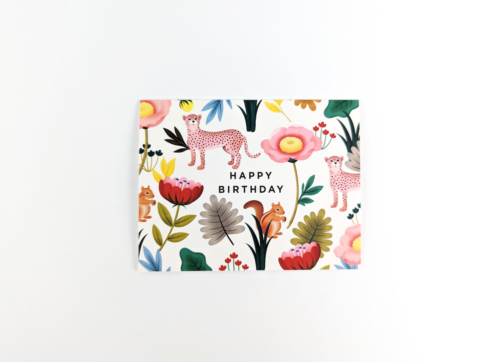 Celebrate a birthday with this card featuring cheetahs, squirrels and colourful flowers. Dimensions: A2 paper (4.25 x 5.5″). Folded blank card on FSC-certified paper. Made in USA.