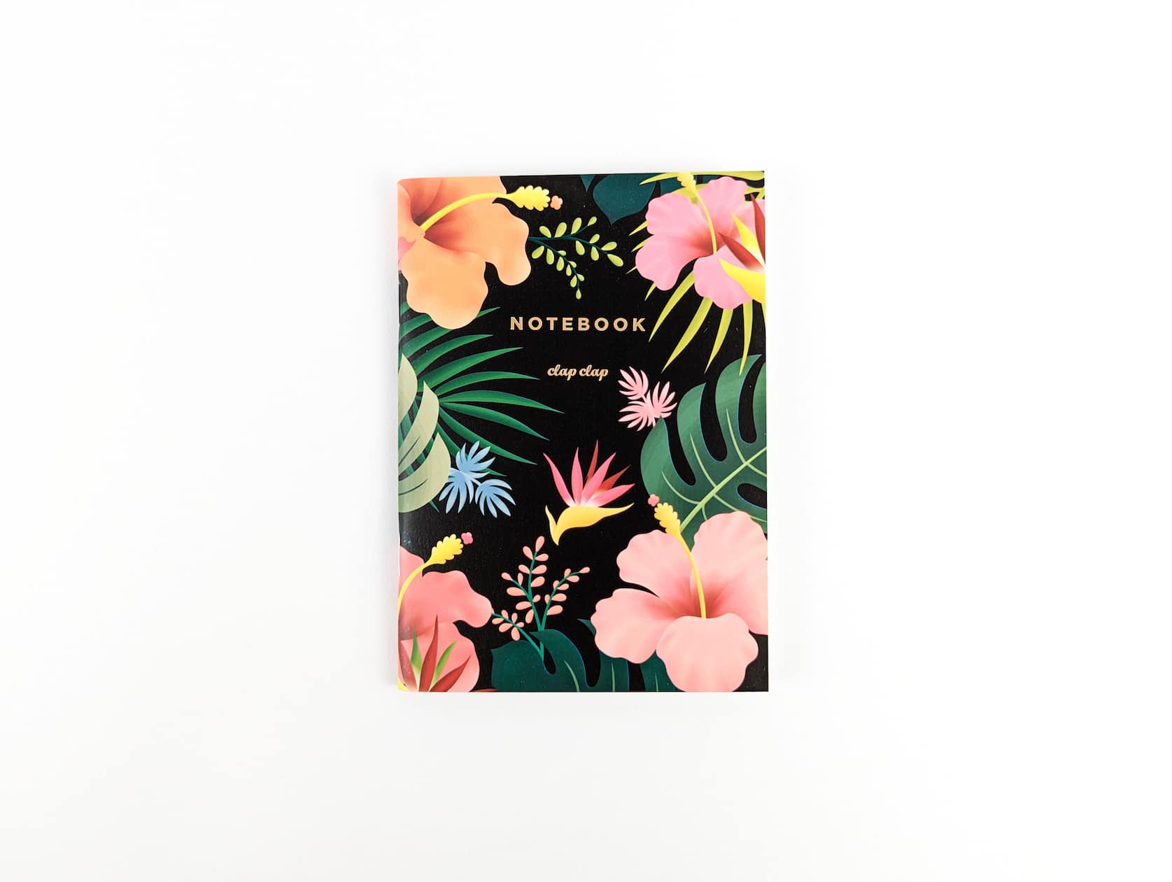 This Clap Clap pocket notebook in cream features cheetahs, squirrels, colourful flowers and a gold foil stamped soft cover with saddle stitch binding. It’s the perfect size to carry on-the-go, and can be used to jot down ideas and notes, or as a daily journal. 64 blank pages with 80 lb. FSC-certified paper. Dimensions: 10.4 x 14.9 cm / 4.1 x 5.9″. Made in Korea.