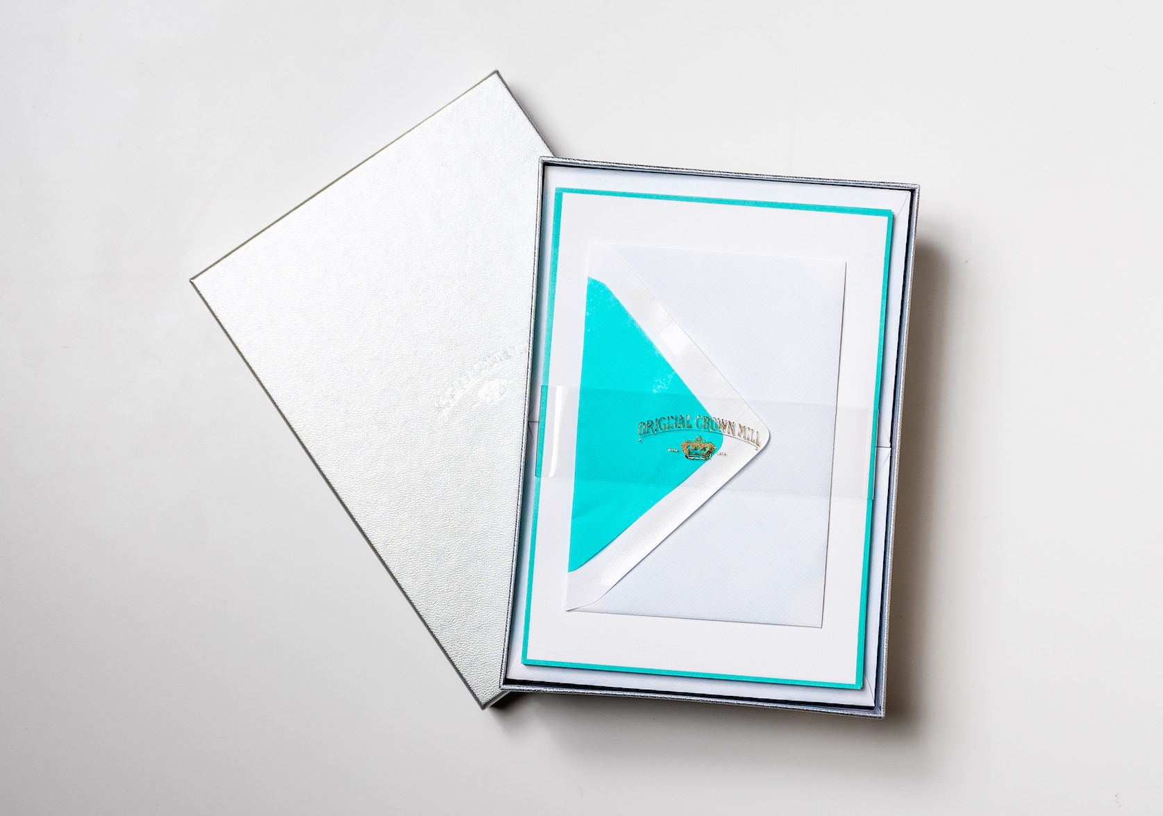 Flat Note Cards – Arctic with navy blue border – Original Crown Mill