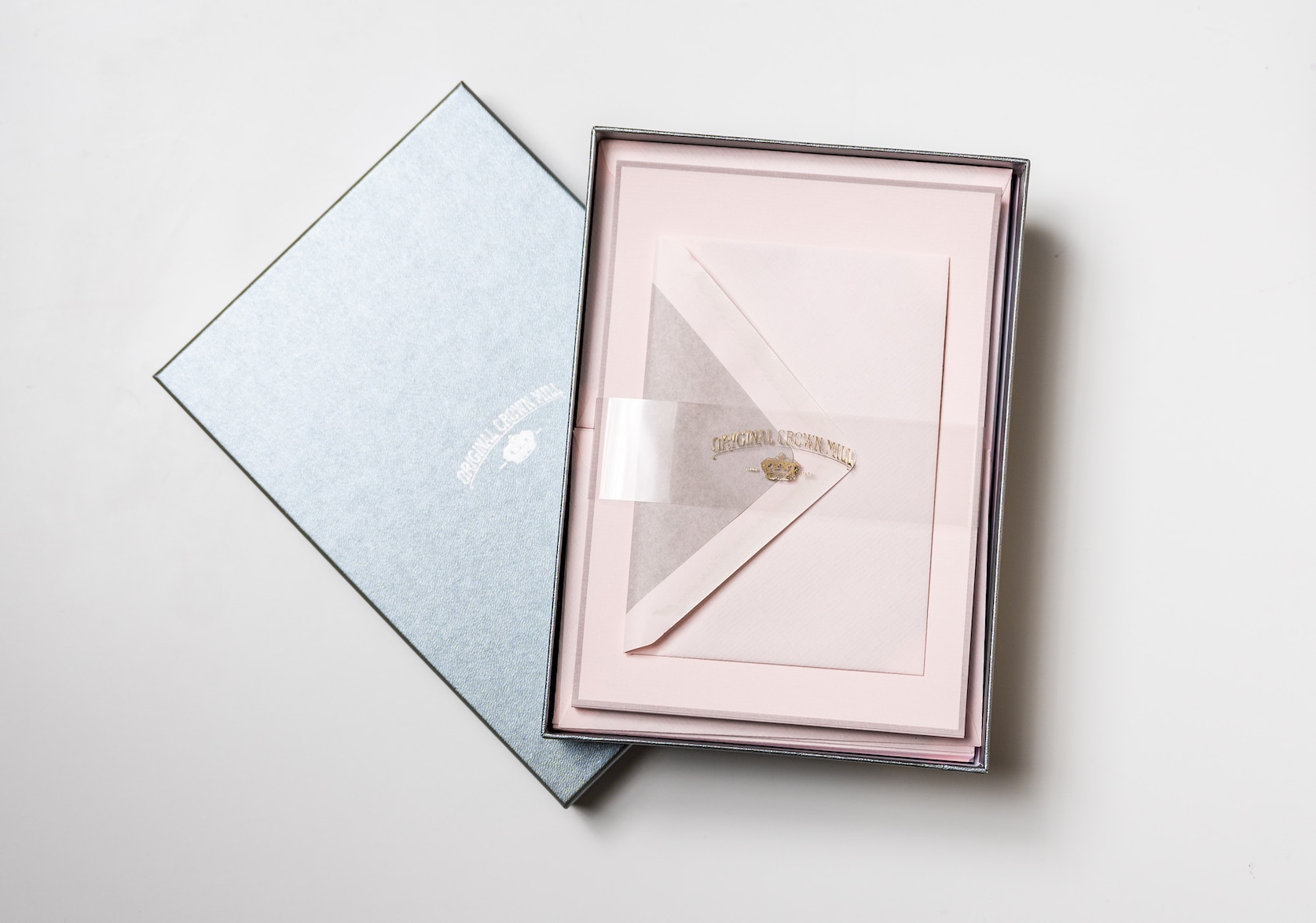 - Two Original Crown Mill mini flat note cards sets, in pink and in grey: