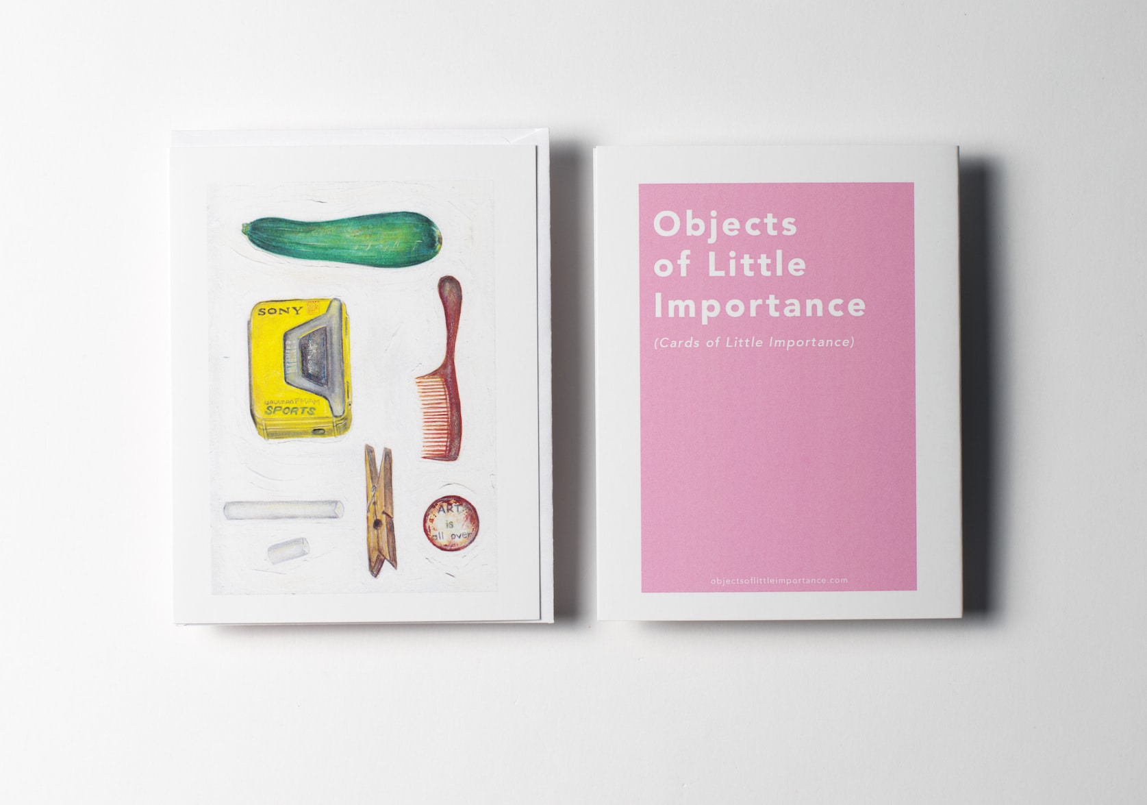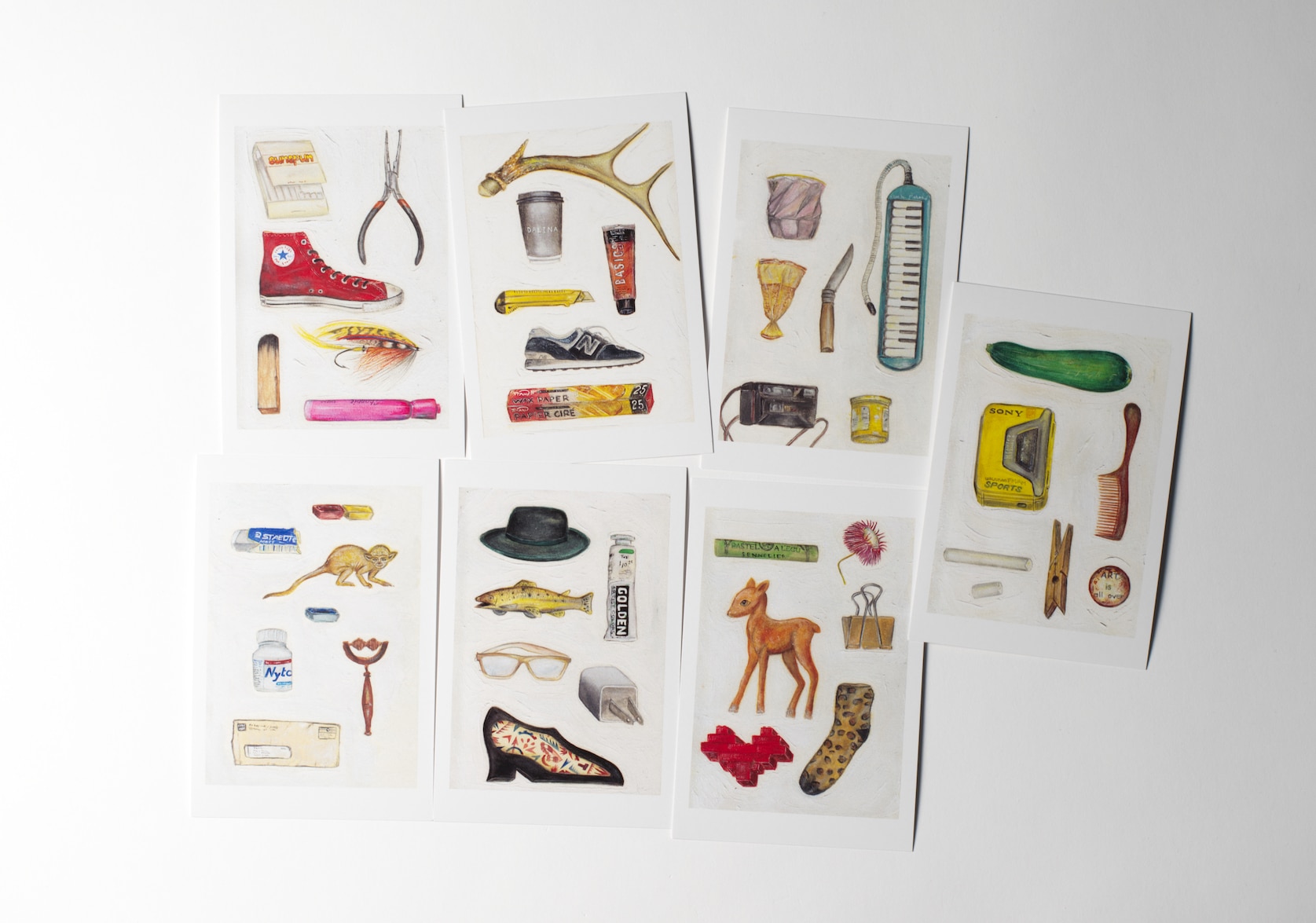This greeting card features six random objects chosen by D. Briker, the artist who painted the artworks in the Objects of Little Importance series. He chose these objects from the home or studio space of fellow artists and creative people in the Vancouver area such as Karin Bubas. From the description by Karin Bubas, these objects of little importance are: