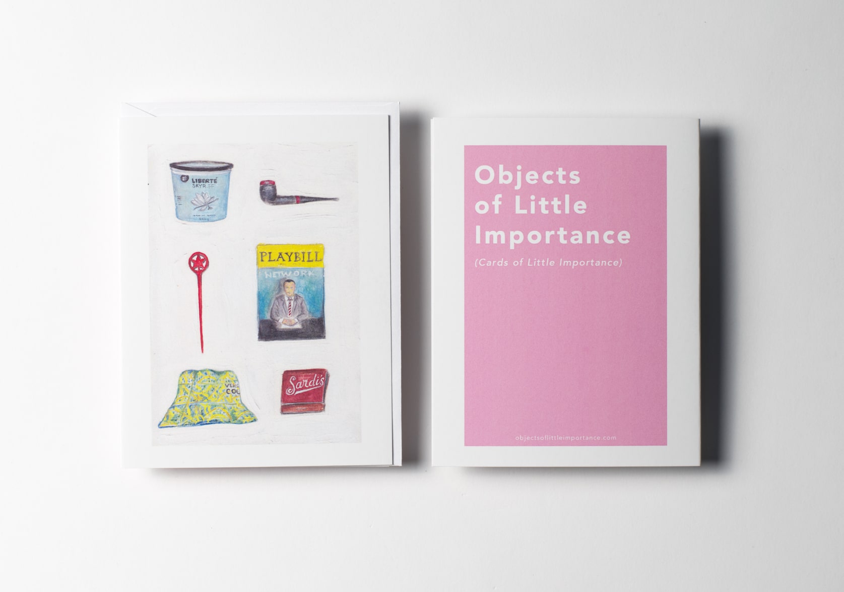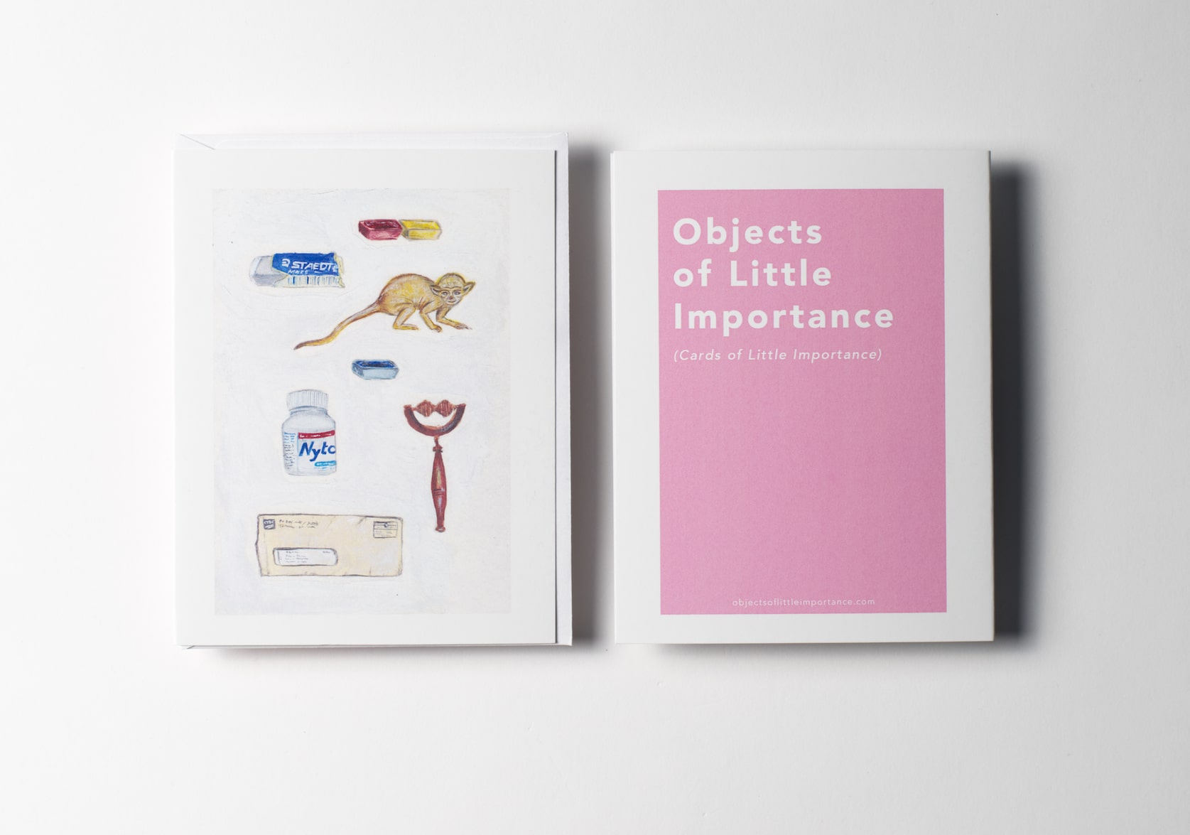 This greeting card features six random objects chosen by D. Briker, the artist who painted the artworks in the Objects of Little Importance series. He chose these objects from the home or studio space of fellow artists and creative people in the Vancouver area such as Zak David. From the description by Zak David, these objects of little importance are: