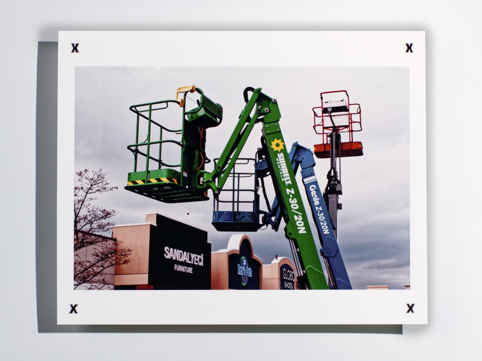 High-quality black & white silver gelatin photographic print on fibre-base paper, featuring toy trucks on a playground.