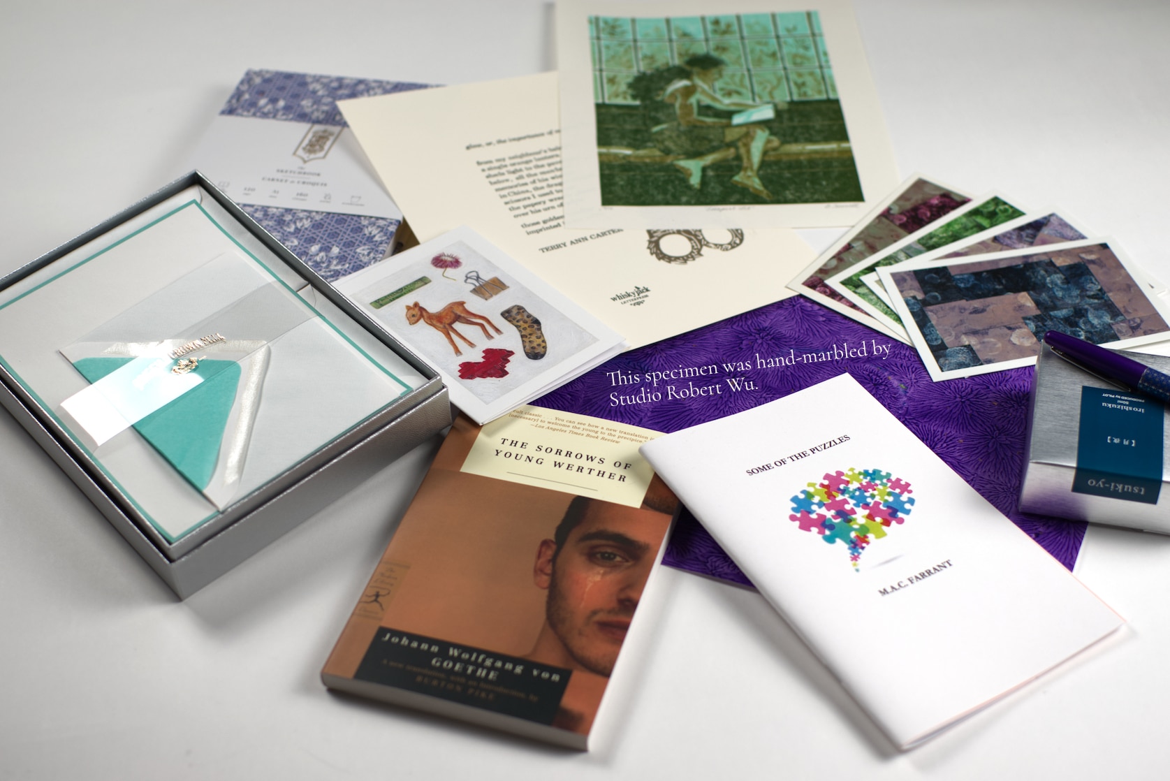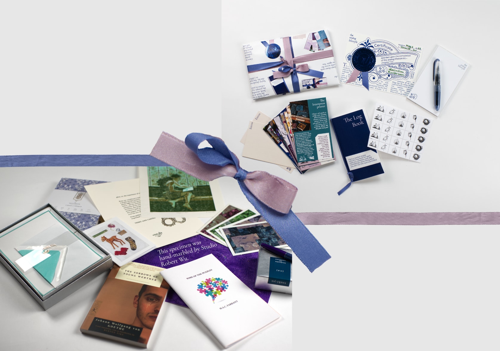 You can record details of your journey in the log book. For each prompt you complete you get one of the symbol stamps. The symbol corresponds to the symbol printed in the lower left hand corner of the prompt cards. There are five suits – all inspired by nature symbols found in The Sorrows of Young Werther: the cabbage, the tulip, the linden leaf, the maybug and the geese. The symbol stamps use actual stamp paper from The Portland Stamp Company and can be pasted into the log book the way you would a affix a real postage stamp.