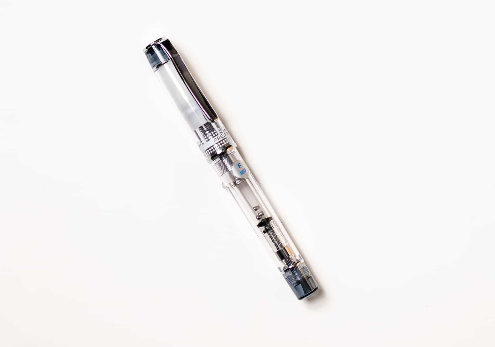 A demonstrator fountain pen with visible ink supply. The Prera fountain pen by Pilot is crafted with a clear resin barrel and frosted light blue accents, showcasing the ink inside. Equipped with a vacuum seal cap and capillary controlled ink delivery system that ensures in is released evenly, Prera fountain pen nibs are protected from drying out and will not blot on writing surfaces.